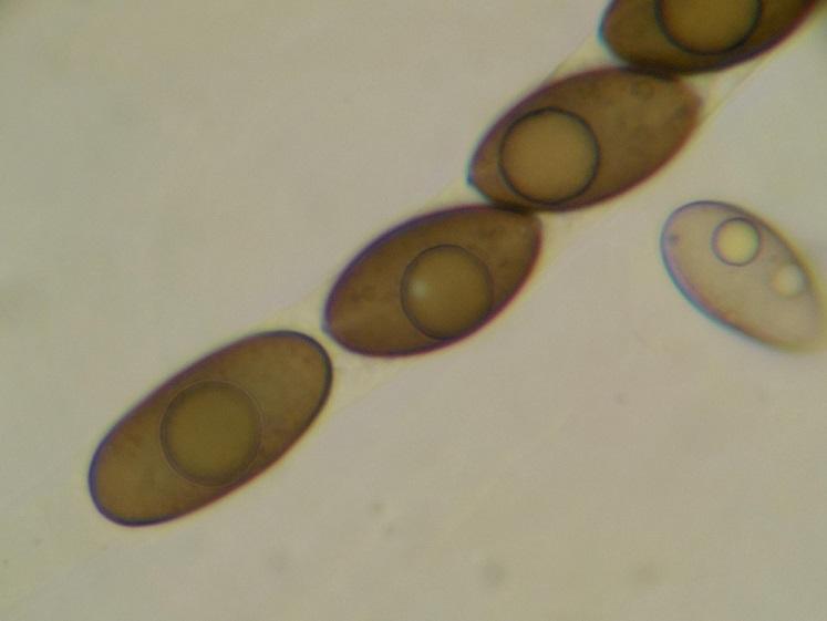 Les ascospores sont classiques pour le genre, en forme de pistache, avec un sillon proéminent sur toute la longueur rendant la spore de profil apiculée aux deux extrémités. Elles mesurent 26-30 x 11,5-14 µm ce qui est au-dessus de tout ce que j'ai pu trouver dans la littérature.