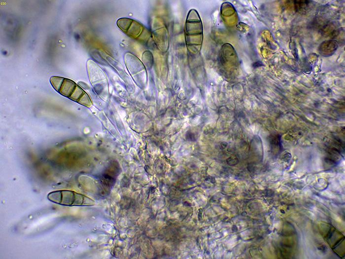 Asci 8-sp., with thin double walls, ca 100 x 12 my. Spores hyaline with up to 7 septa and a constriction at the centre, 38.3 (34-43) x 5.1 (4.5-6) µm, Q = 5,5