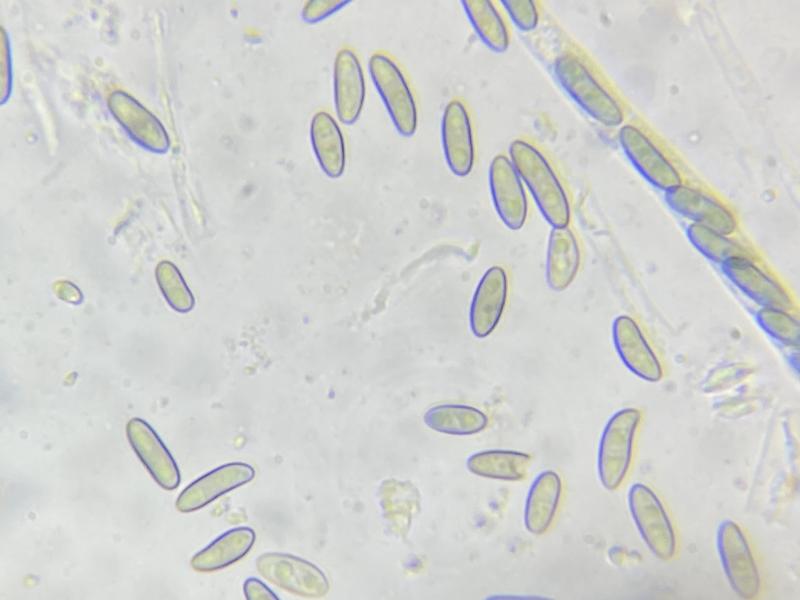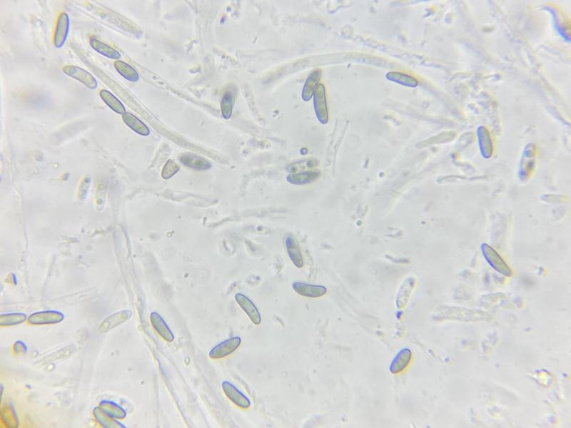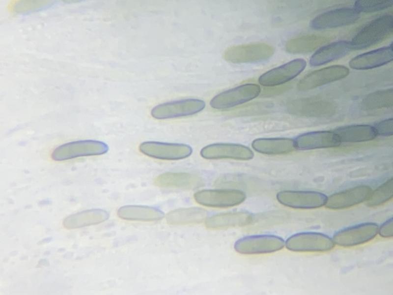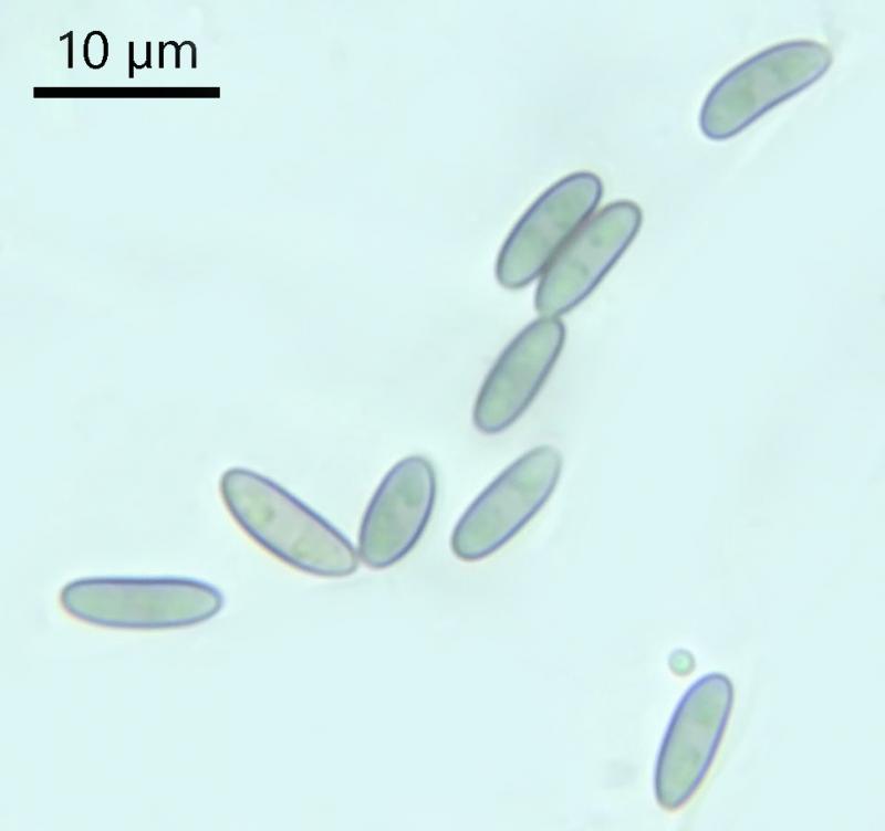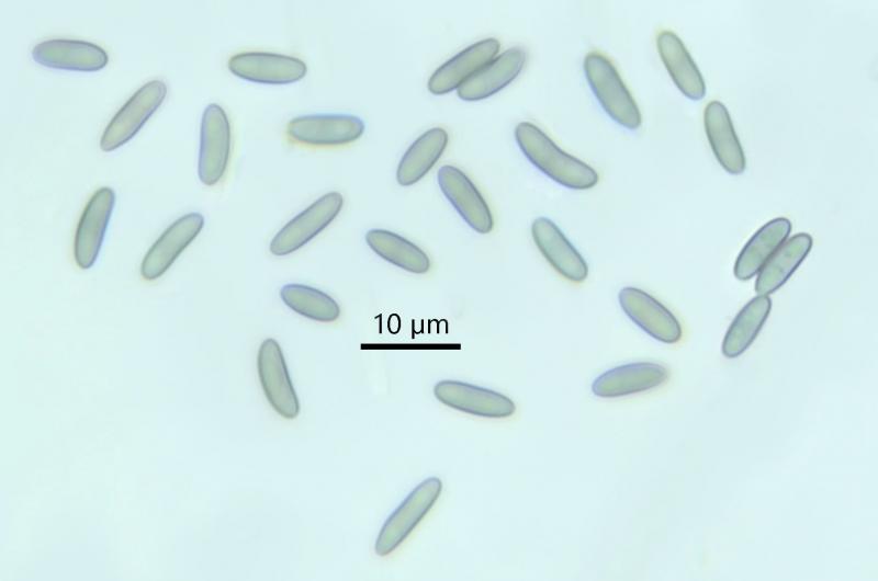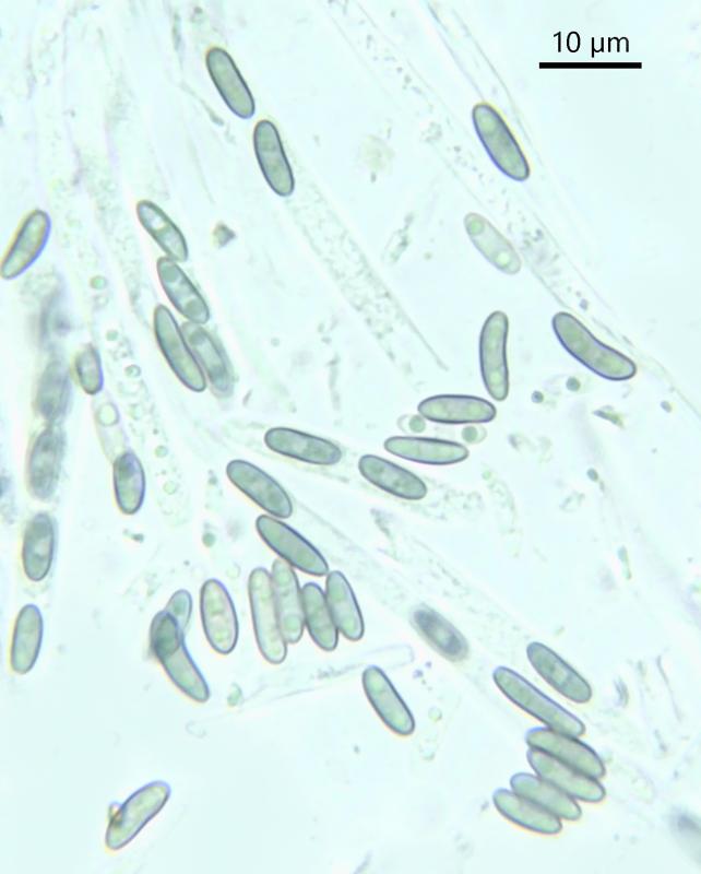 Spores: 7.5–9.7 × 2.6–2.9 µm, turning greenish-blue in 3% KOH