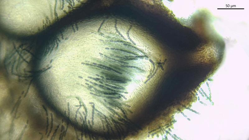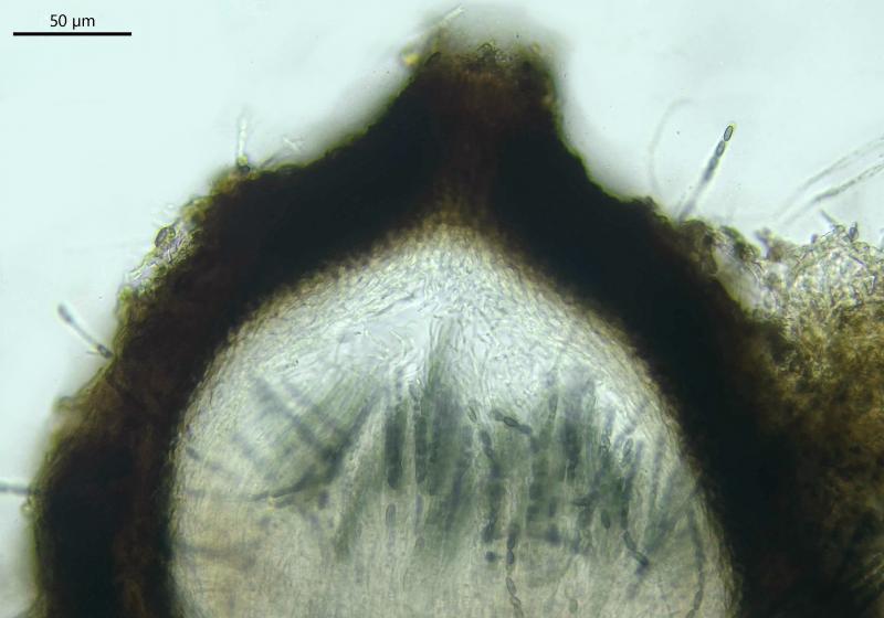 Asci: 8-spored, IKI– in both Melzer's and Lugol's reagents, in Baral's reagent finely blueish