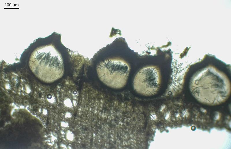 you should first make sure that what you call perithecia are not ostioles in relation with immersed perithecia. Take a razor blade and make a nice vertical section along the grain of the wood.