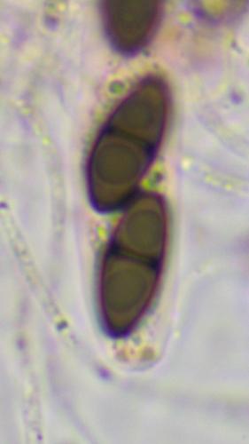 Spores centrally septate, greenish brown, smooth, with a large guttule in each cell and a rather well visible germ Pore on one side, 11-14.5 x 5.0-5.6 (-6.0) µm. Asci 110-140 x 6-7 µm with an inconspicuous but visible apical apparatus that shows no iodine reactions.
