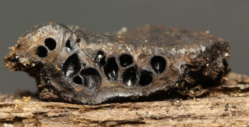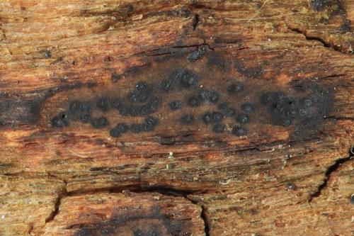 Perithecia in groups of variable size immersed in the wood. The surface area around the emerging ostioles is blackened. Ostioles are minutely umbilicate. The wood surrounding the perithecia is not conspicuously discoloured and there is no black line in the wood. Perithecial diameter 0.3-0.6 mm, necks 0.2-0.6 mm.
