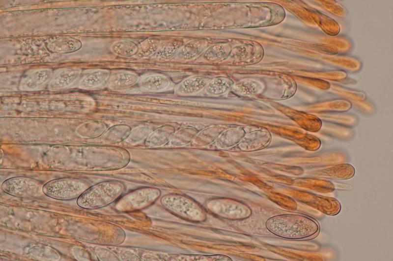 | Remarque | Apothecia 2.5 - 5 mm Spores 25.8 - 27.8 x 11.5 - 12.9 Q = 2 - 2.3 Exosporium loosening in lactophenol Hairs dark, septate, pointed to 350 microns Spores mostly warted with some ridges. |