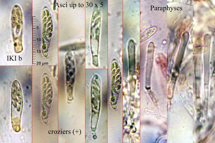Asci up to 60 x 15, IKI b, with croziers, 8-spored. Paraphyses cylindrical, obtuse, withouth Vb's.