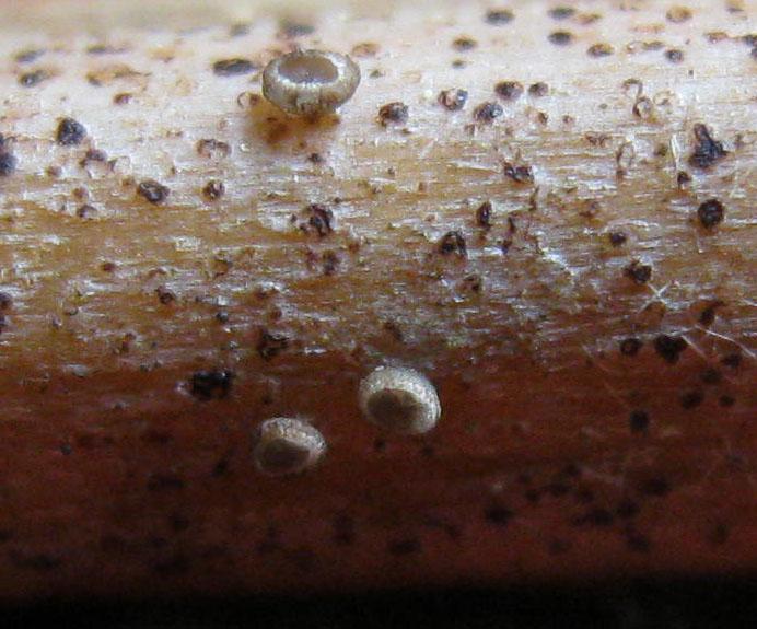 It is almoust sessile, greyish, 0,3-0,5 mm wide and is lighter at margins.