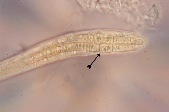 The yellowish ascospores are persistently 5-septate, 6-celled, and the third cell are apically sligthly enlarged.