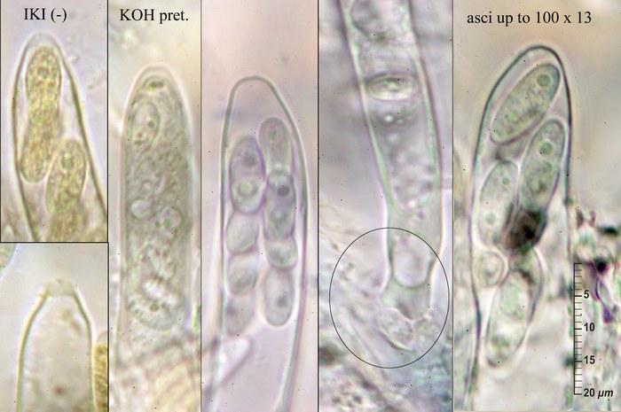 Asci 8-spored, IKI negative (KOH pret. negative too), croziers +, up to 100 x 13.