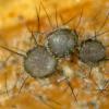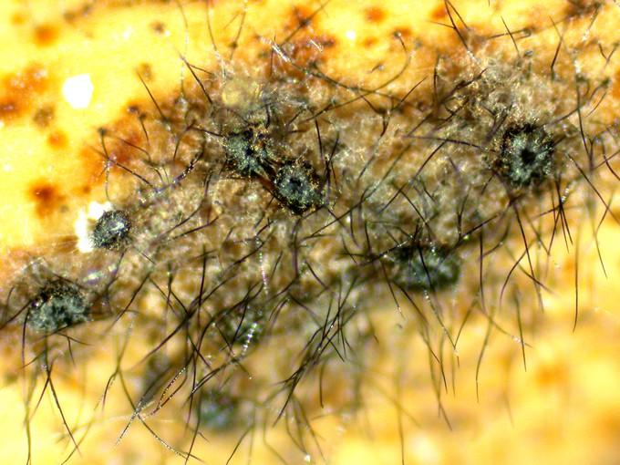 Poils des flancs 70-90, parois épaisses, brun noirâtre, spiralés, avec des amas glutineux en surface.