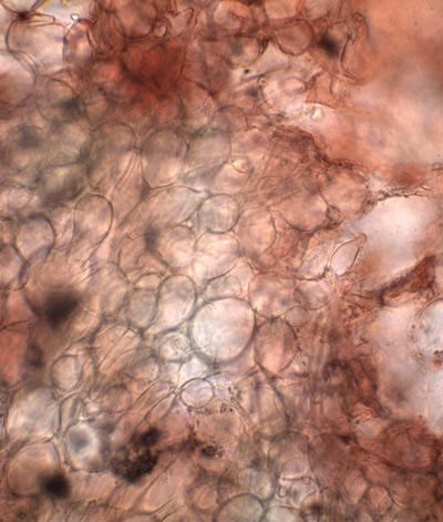 Excipulo medular globular, excipulo ectal con elementos filiformes.
