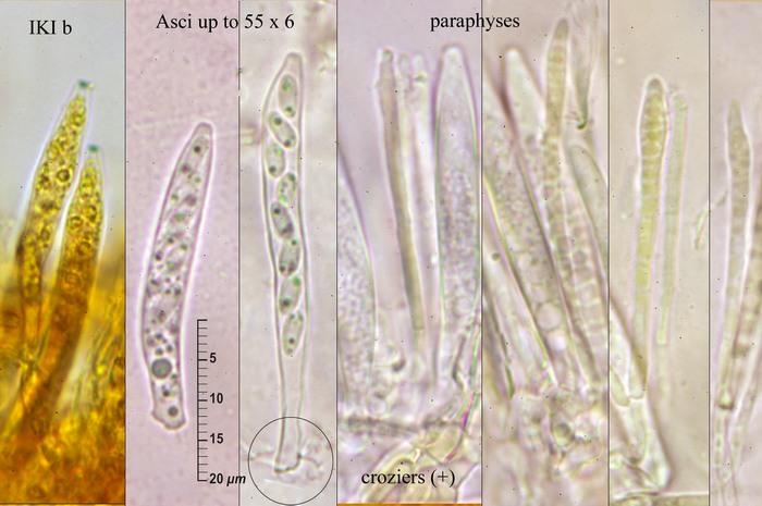 Yesterday I have collected on Tilia wood at 800 m of altitude these small ascomata up to 0.45 mm in diam. with IKI bb asci, croziers (+), some of them with basal globule and + or - lanceolate paraphyses with small yellowish Vb's. Ectal excipulum of an elongate textura prismatica without gelified tissues.