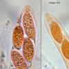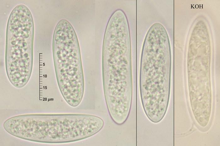The asci, long cylindrical, up to 325 x 17, have an obvious apical apparatus with an