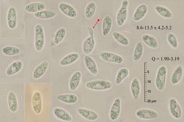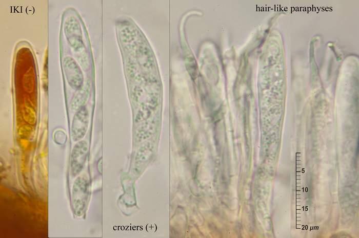 The asci are 8-spored, IKI negative, croziers positive. Some ascospores seem to make