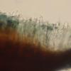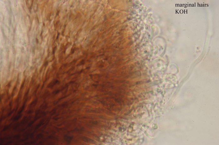 The ascomata, turbinate and attached by a narrow point, are vinaceous brown and the hymenial surface (and the excipulum too) is very pruinose by the existence oh hooked granulate hair-like paraphyses. The excipular and marginal hairs are hyaline or subhyaline with hooked and granulate neck, whith any refringence at their walls and they arise from the