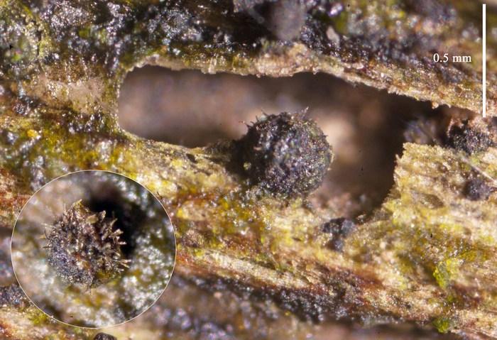 My friend J. Linde found these gregarious, + or - sphaerical, semiinmersed or subsuperficial, blackish, uniperitheciate, small (up to 0.4 mm) and hairy perithecia on semirotten wood of Pseudotsuga menziesii in a shady place.