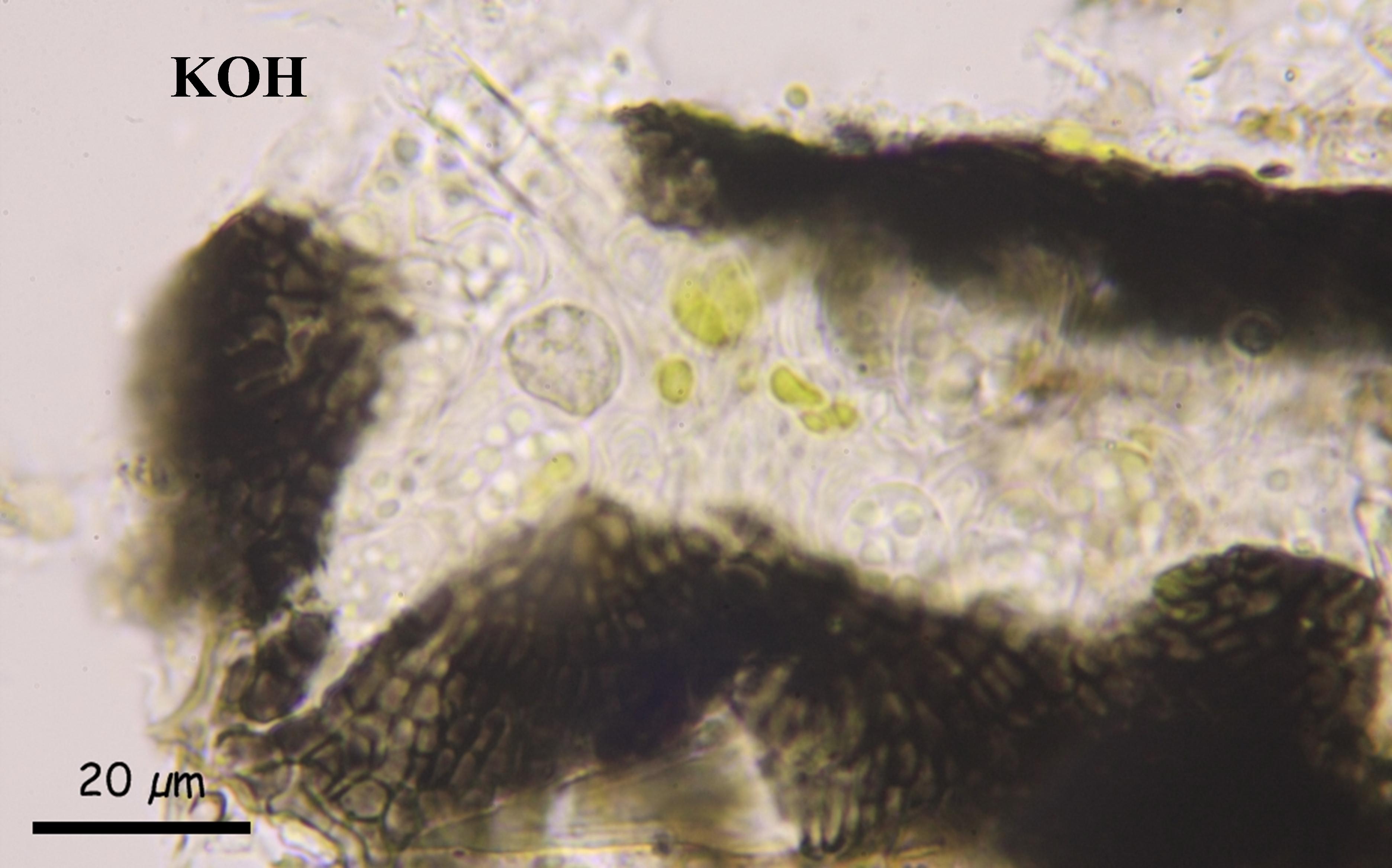 Ascomas formando surcos de entre 40 y 60 µm de anchos, a modo de laberinto, con dos capas oscuras a los lados, exponiendo el himenio hialino en el centro. Ascas de aproximadamente 15,16 - 20,71 x 10,80 - 12,99, octospóricas, no amiloides. Esporas de (7,01) 7,58 - 8,56 (9,38) x (3,30) 3,40 - 3,72 (3,90) µm; Me = 8,05 x 3,58 µm ; Qe = 2,25, hialinas, con un septo transversal que divide las esporas en dos partes generalmente desiguales, con una gútula de aceite en cada parte (rara vez dos en la parte inferior). No he visto paráfisis.