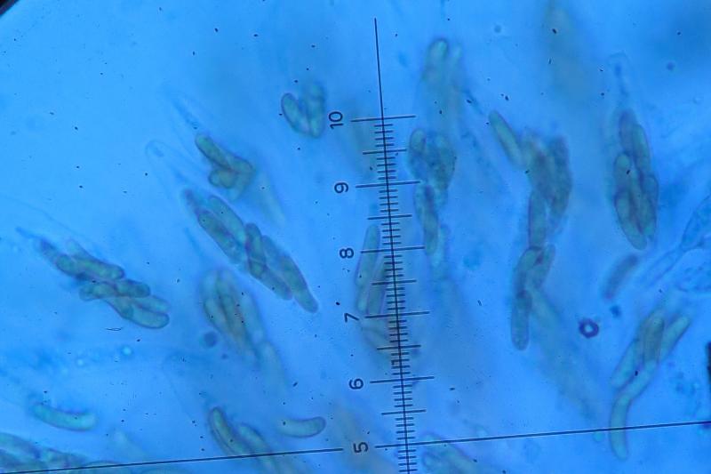 I found this species on unknown hardwoord. Frb 2/4mm x 1mm. At the inside you can see multiple round holes (diam 0,5x0,3mm). Spores with 2 very small drops. Size 2/3x9/12µm.