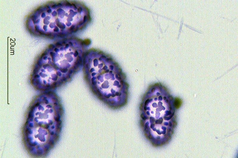 Esporas bigutuladas y verrugosas de 17-20 x 10-11,5 micras.