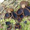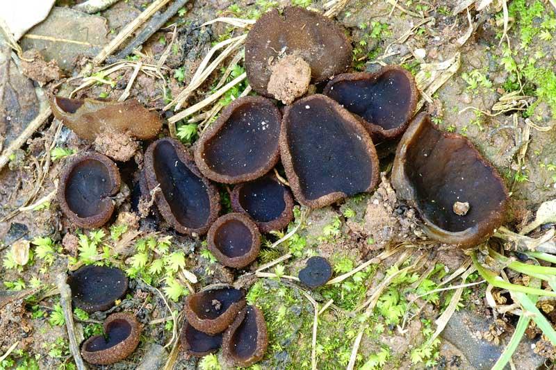 Look around Peziza michelii (with violet) or Peziza succosella - P. infuscata (without violet). In mediterranean areas these species looks darker than in colder places.