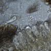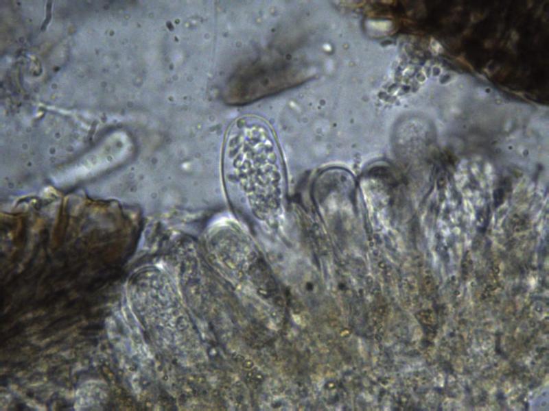 The fully black, sessile apothecia about 1 mm contain short-stalked, unripe thick-walled asci smaller than 30/12 µm and inside are many very small, roundish-elongate spores that are hard to characterise. I did not find spores outside the ascus. The hymenium is covered by a black epithecium like in a lichen. Any reaction with IKI is not observable to me. The excipulum consists of brown isodiametrical thick-walled cells.