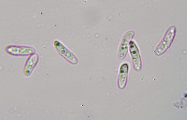 Spores 1 septum, with guttules 8-12 x 2.9-3.6µm, slightly constricted at the septum