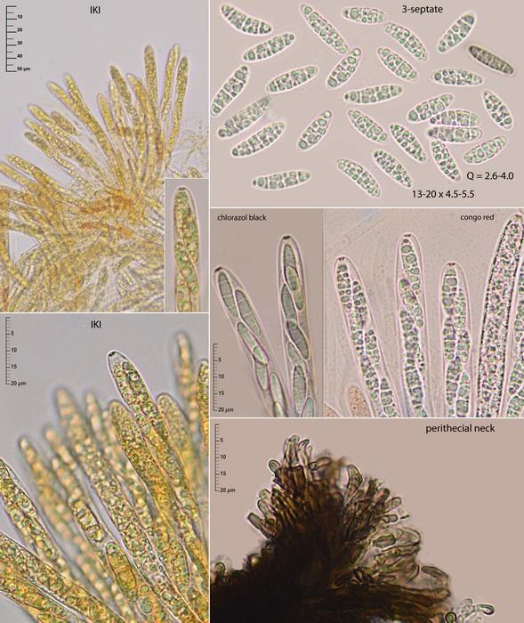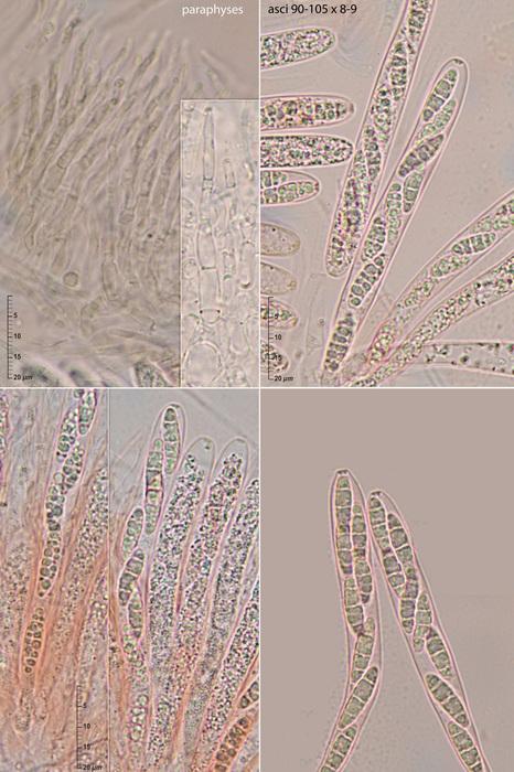 Ascospores hyaline, smooth, 3-septate, 13-20 x 4.5-5.5, with many guttules, with no gel seath, no appendages. Paraphyses septate, apically attenuated.
