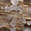 Apothecia very densely gregarious, narrowly sessile, 0.3-0.7 mm in diam., whitish, amber when drying, margen even, only minutely downy as the excipulum.