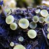 Ascobolus furfuraceus. Cuando es muy joven tiene color verdoso y al ir madurando las esporas se vuelven, y con ellas también el ascoma, de color violeta.
