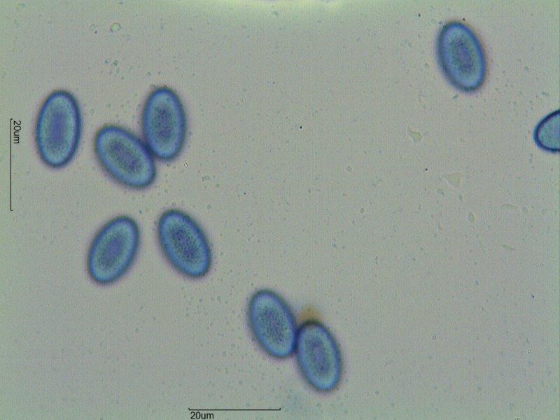 Esporas de 15,5-17,8 x 9,3-10,5 micras, bigutuladas y con verrugas muy finas cianofilas.