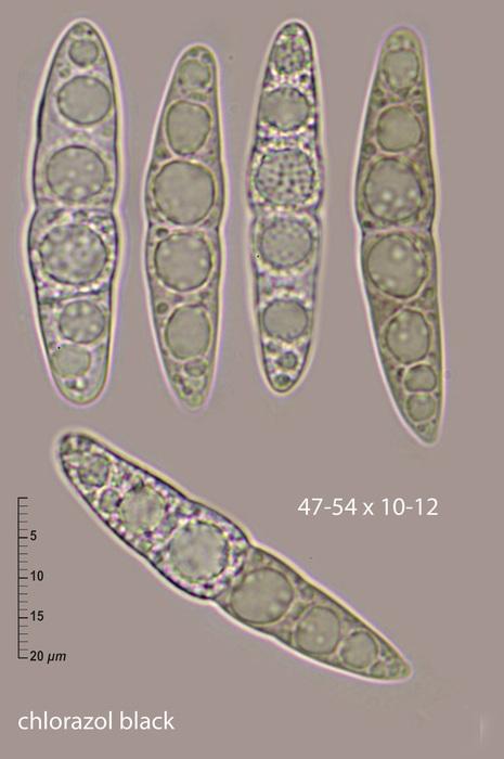 The ascospores are hyaline and 1 septate, later greyish-brown, verrucose and secondarily septate, with no sheath or with only a thiny sheath when young. Asci clavate, bitunicate, 137-162 x 18-23, with 8 ascospores. Pseudoparaphyses cellular.