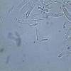 Esporas con grupo de gotas pequeñas en los polos miden 11--14 x 2--2,5