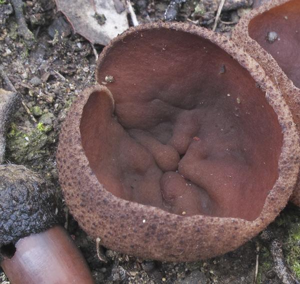 Ascomas de hasta 30 mm, himenio de color pardo rojizo, excipulo de muy furfuraceo de color más claro.Ascas 325-400 X 14-15 um, amiloides, pleurorincas.
