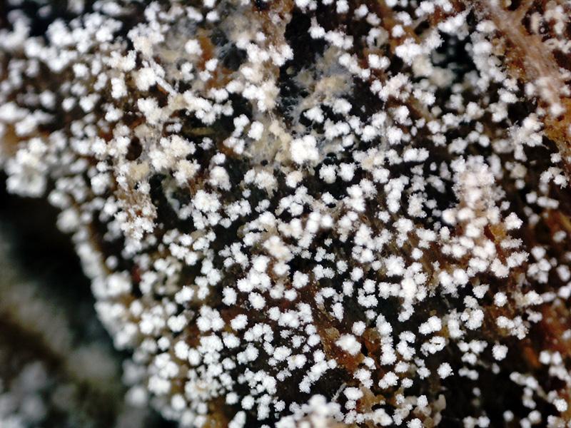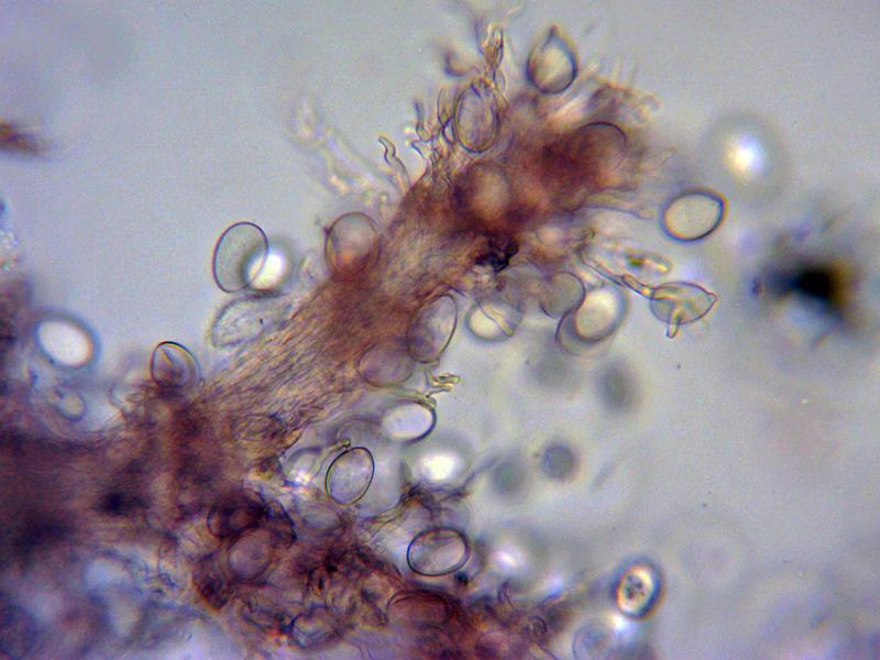 Pequeños cuerpos algodonosos con un corto pié, de color blanco y con un diámetro de tan solo entre 0,16 a 0,25 mm., estos compartían espacio con unos ejemplares de Nectria peziza (en la imágen abajo a la derecha), aunque no creo que tengan ninguna relación con la especie descrita.
