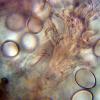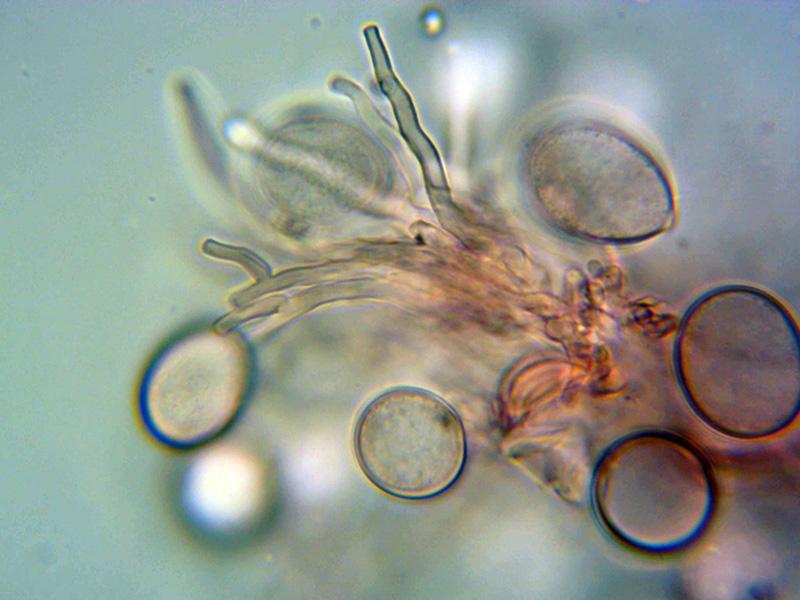 En su microscopía solo destacar unas hifas dispuestas paralelamente, ramificadas y terminando en unas hifas conidiógenas irregulares, con septos simples, con una anchura de entre 3,2 a 3,5 µm y con ensanchamientos que pueden llegar a las 6,2 µm.