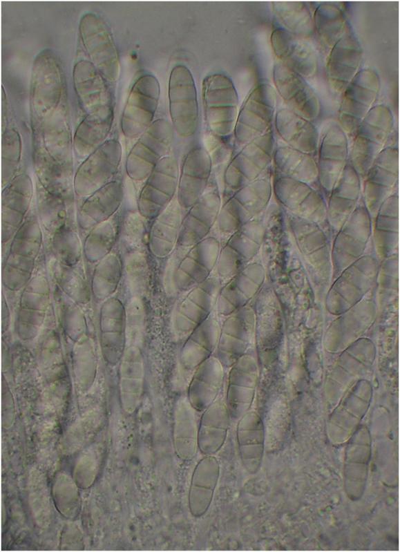 Creo que puede tratarse de Discostroma, y en particular D. fuscellum, aunque el ancho esporal es sensiblemente menor.