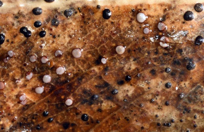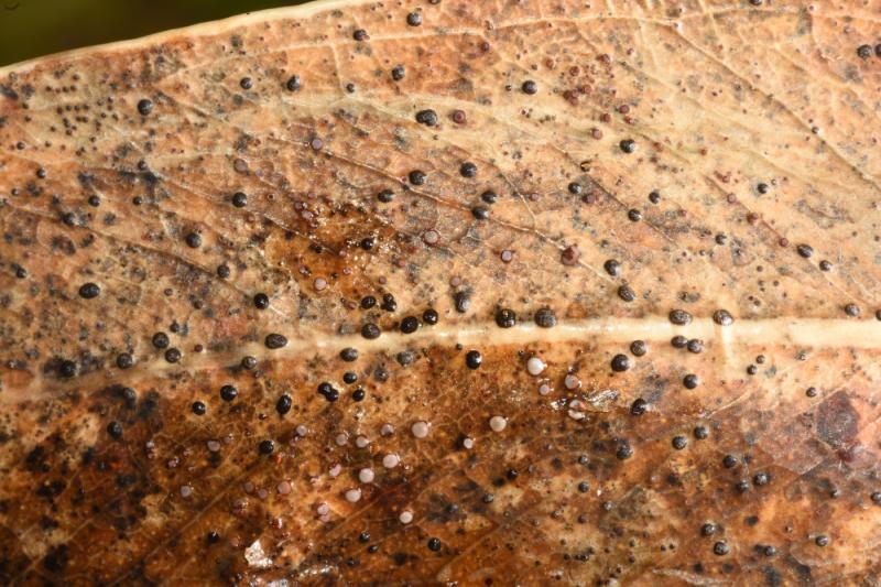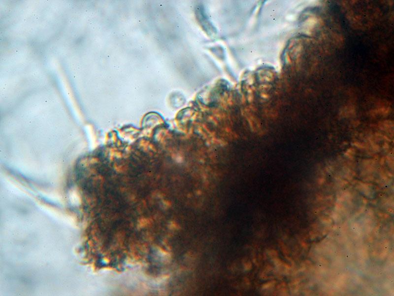 Pilidium sp. Entre los conidiomas que has fotografiado también suele haber ascomas con ascos y esporas.
