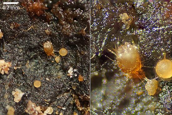 Tiny apothecia growing in incubated deer dung. The hairs had any septa and the dextrinoid reaction of the hairs is inconsistent but sometimes present especially towards the base.
