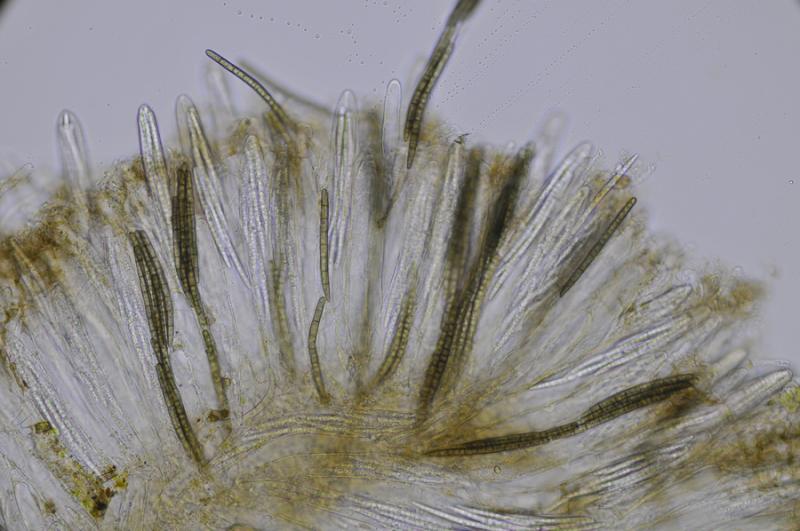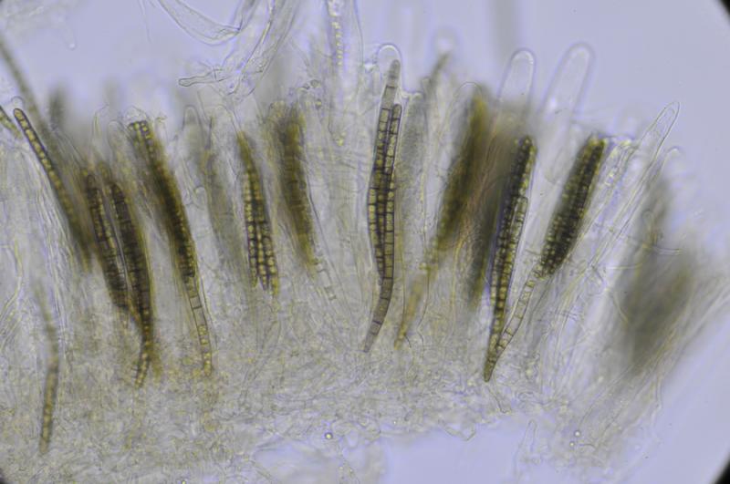 Es la presencia de muchas esporas hialinas que contienen una sola guttule ancha en el ancho de la espora. . Las esporas de +7 a veces faltan en las preparaciones. Las paraifisis son muy diversas. Además, el estipite está revestido con pequeñas pilas de células, claramente visibles en el espécimen de la izquierda. Estpite que siempre es