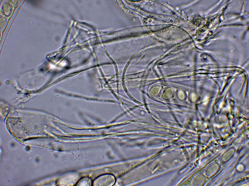 Paráfisis filiformes, hialinas con múltiples septos, sin ensanchamientos en el ápice y generalmente curvados.