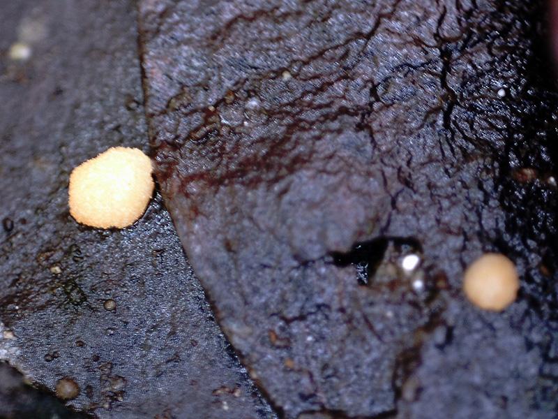 Unos diminutos apotecios con forma de grano, de color anaranjado claro, de entre 0,8 a 1,3 mm. de diámetro, brotando de manera dispersa sobre unas hojas en descomposición ya bastante degradadas de planifolio tropical indeterminado, fotografiadas en la zona de Laguna Bávaro (República Dominicana).