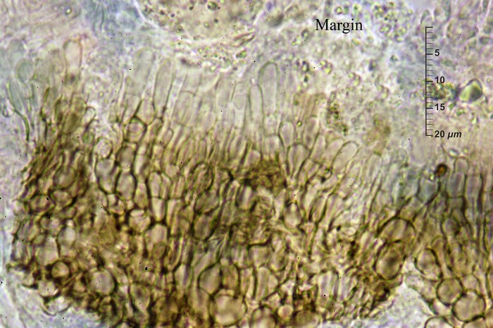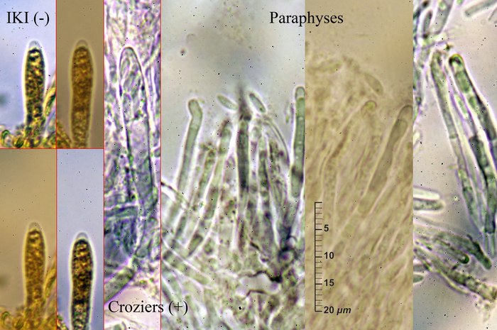 This Mollisia (?) species grows on very wet wood together with Lasiosphaeriaceae species. It has cupulate and gregarious ascomata up to 0.5 mm, with amber brownish colours and small white rims.